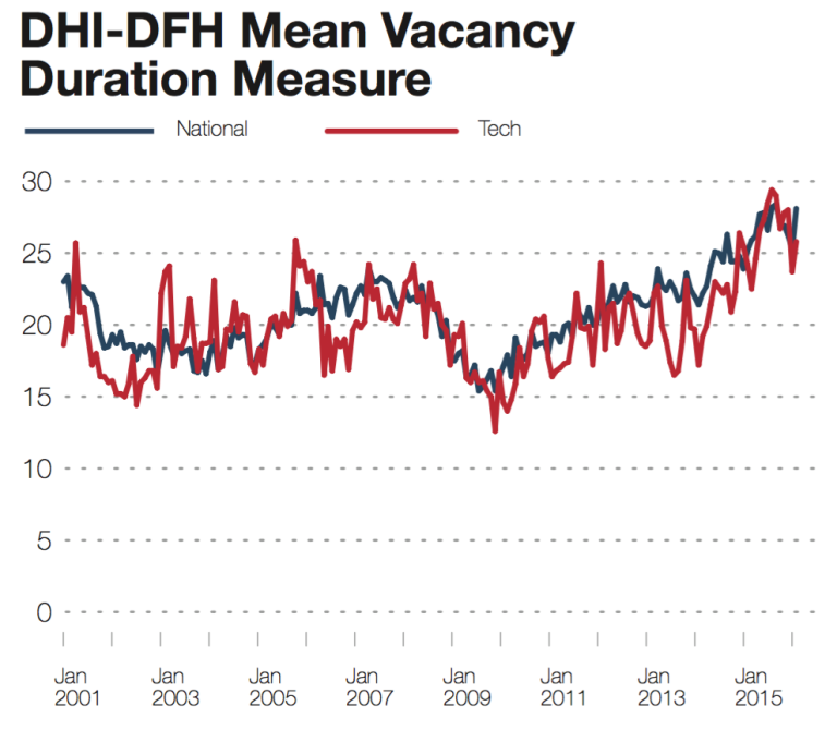 The DHI-DFH Mean Vacancy Duration measure found the average job vacancy duration of Professional and Business Services jobs 25.8 working days in January, up from 23.7 days in December 2015. The average job vacancy duration in the U.S. is near peak levels at 28.1 days. “Hiring at the start of this year is better for some industries than others. Healthcare is doing well bolstered by demand for skilled talent and favorable market conditions, while the energy industry continues to lag,” said Michael Durney, President and CEO of DHI Group, Inc. “Financial services and tech are both coming off a strong year of job creation and employers continue to recruit for those hard-to-find professionals to fill open roles.”