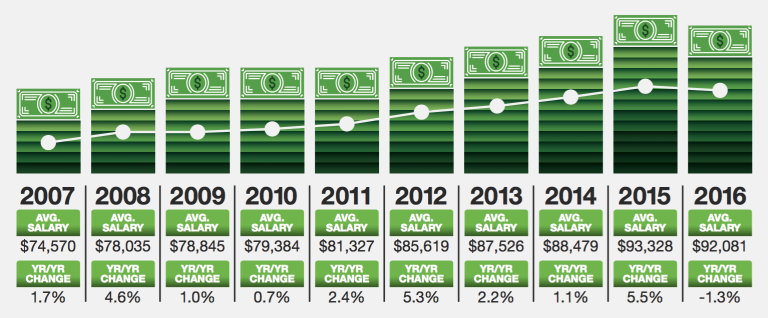 The 2016 Dice Salary Survey was administered online by Dice.com, with 12,907 employed technology professionals responding between October 26, 2016 and January 24, 2017. Respondents were invited to participate in the survey in one of two ways: 1) via an email invitation to Dice.com’s registered (“searchable”) database members; 2) through a notification on the Dice.com home page and/or via “pop-up” invitations. The latter method was used only to improve response rates for a small number of respondent types. A cookie methodology was used to ensure that there was no duplication of responses between or within the various sample groups, and duplicate responses from a single email address were removed. The Dice Salary Survey was adjusted for inflation in 2013 for technology professionals earning salaries of $350,000 and above were not automatically eliminated from the survey if they met other criteria. *Due to a high number of outliers in the data, the 2015 salary number was revised to better reflect a change in outlier methodology and an adjusted number has been reported this year.